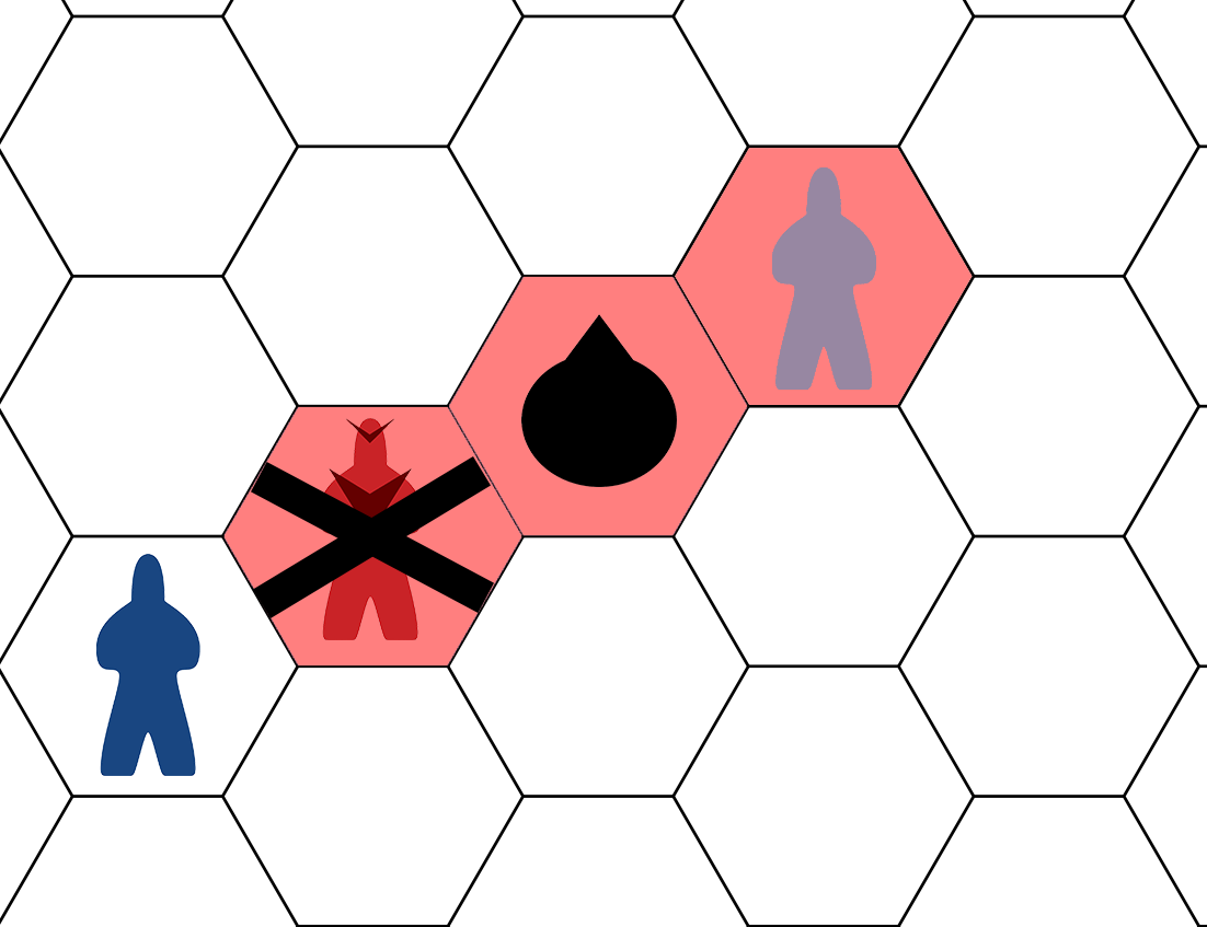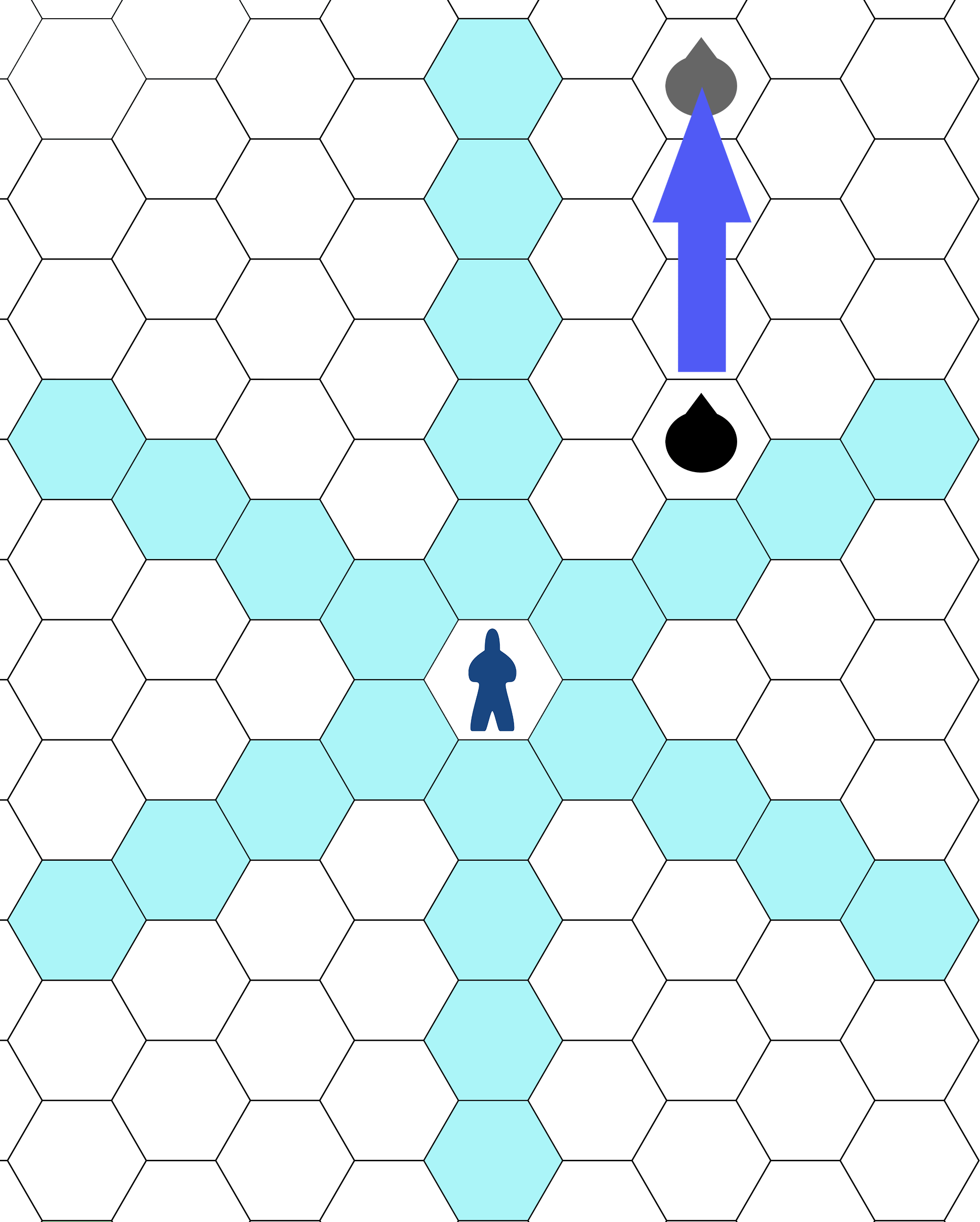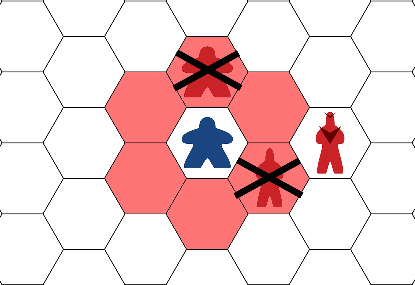 The person/meeple shaped piece is the Brute. It has a maximum movespeed of 2. Its ability is an active that kills all enemy pieces within one unit of it.(Figure 5) It can activate its ability at any time during the action phase.
