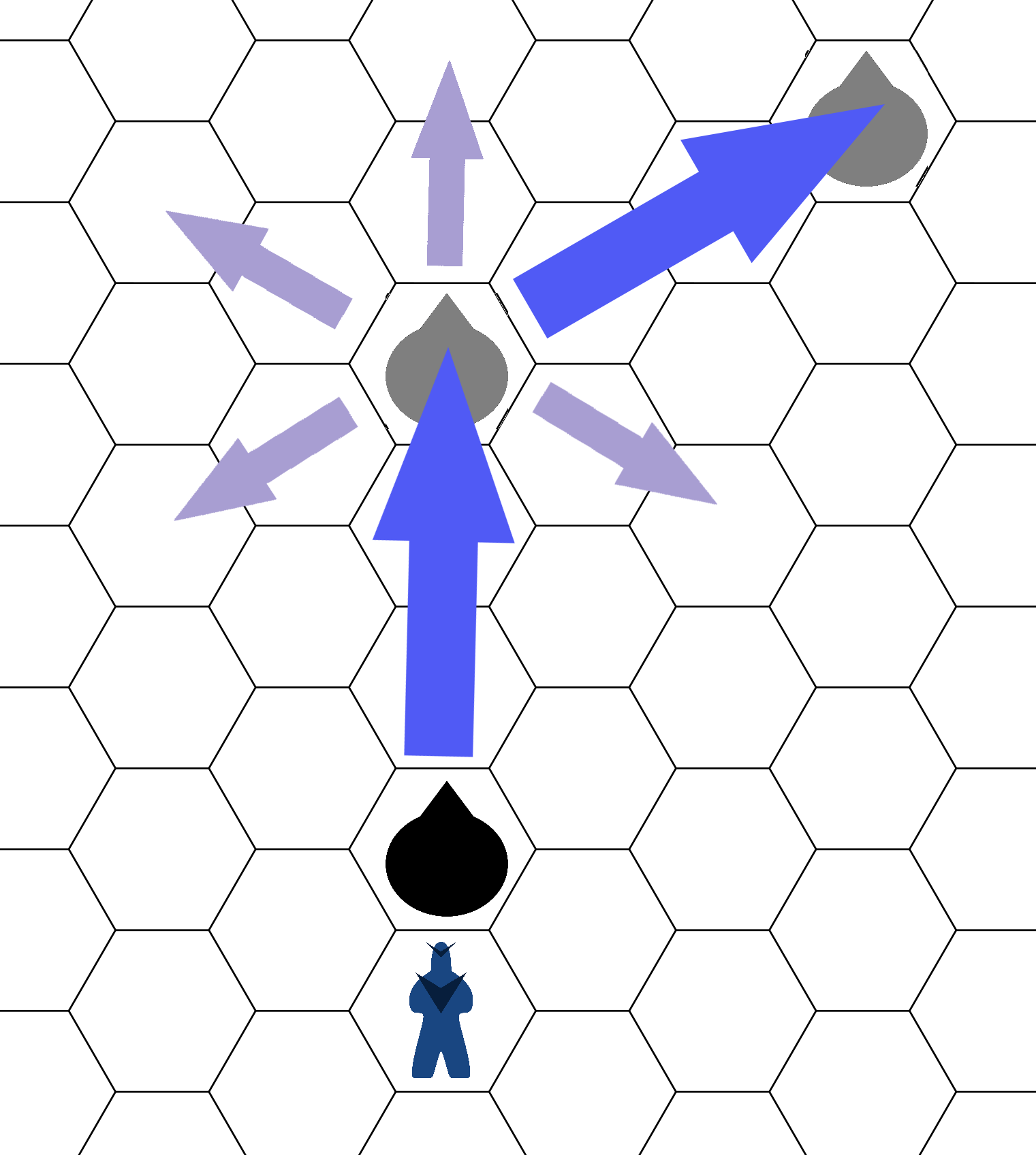 The pawn shaped piece is the Interceptor. It has a maximum movespeed of 4. One of its abilities is that it passively gains +1 movespeed when moving in the same direction that the disc is moving.(Figure 1) The Interceptor's active ability can only be used when the piece is 2 or less spaces away from the disc. When it is activated move the Interceptor 3 spaces in the direction that is toward the disc from the space which the ability was activated.(Figure 2) This should always leave you overshooting the disc by one or two. Unlike regular movement, the Interceptor does not stop moving when diving through the disc. When diving, if moving through or landing on an enemy or landing on an ally; destroy that piece. After diving, your piece will become grounded until the end of your next turn. While grounded your piece cannot throw the disc.