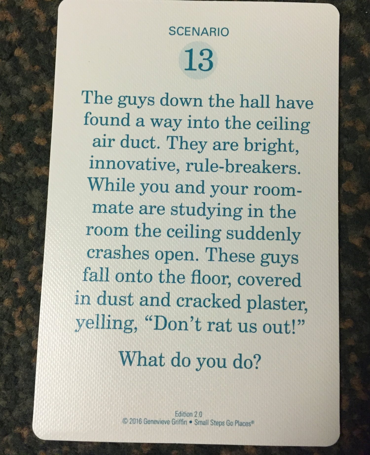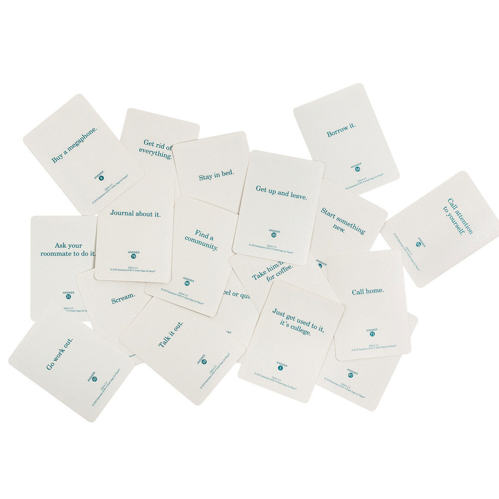The objective of Option Play is to get people talking about their future at college in any capacity. Even when joking about the things you do in the future people took away practical knowledge about what to actually do in some of these scenarios. The way the game plays is meant to metaphorically represent what college is like. "You must play with the hand you are dealt." This is the montra that was repeated throughout development. It really brings about the variance of dorm life.